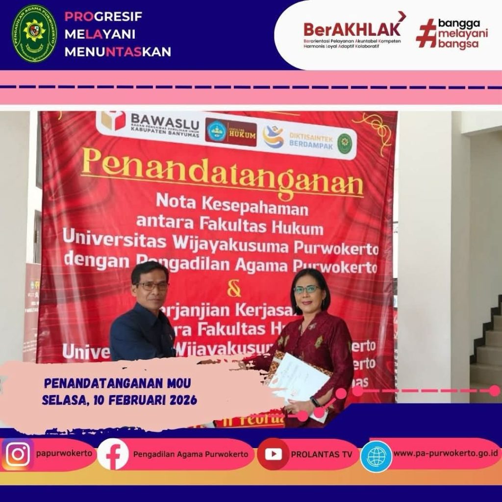 Selasa, 10 Februari 2026 – Penandatanganan nota kesepahaman antara Pengadilan Agama Purwokerto dengan Fakultas Hukum Universitas Wijaya Kusuma Purwokerto, tujuan terlaksananya Memorandum of Understanding (MoU) antara Pengadilan Agama Purwokerto dan Fakultas Hukum Universitas Wijaya Kusuma Purwokertoadalah sebagai landasan hukum formal untuk menyinergikan dunia akademik dengan praktik hukum di lapangan. Kerja sama ini biasanya mencakup aspek-aspek Tridarma […]